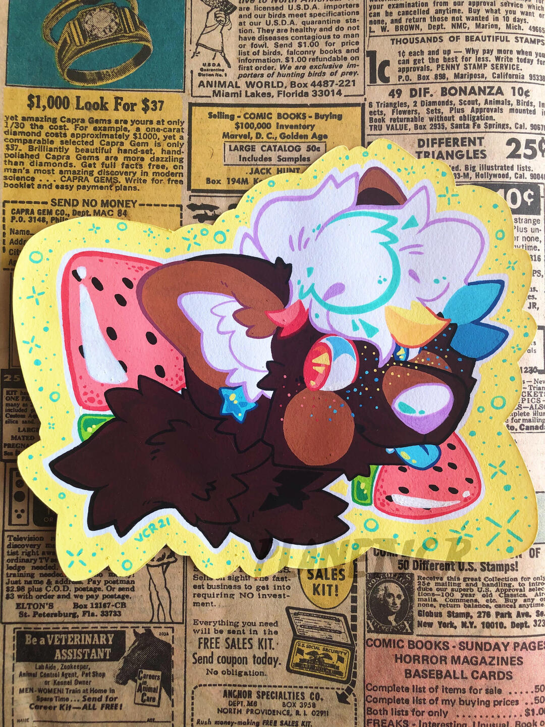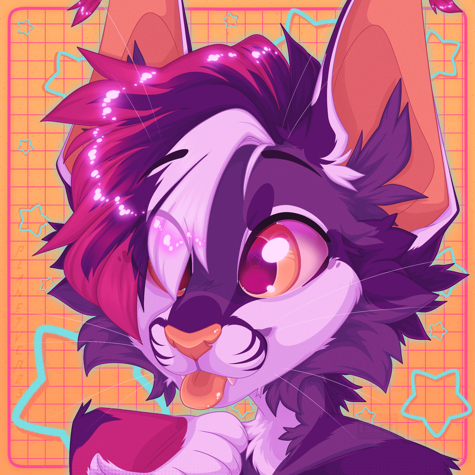 A bright & bold chibi styled icon of your OC! Characterized by saturated filters, halftone detailing, and neon backgrounds. Can be made to link/interact with another!Single: $40