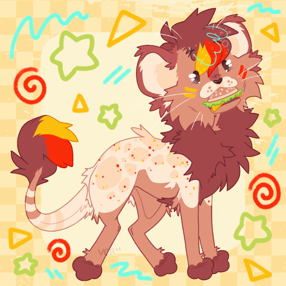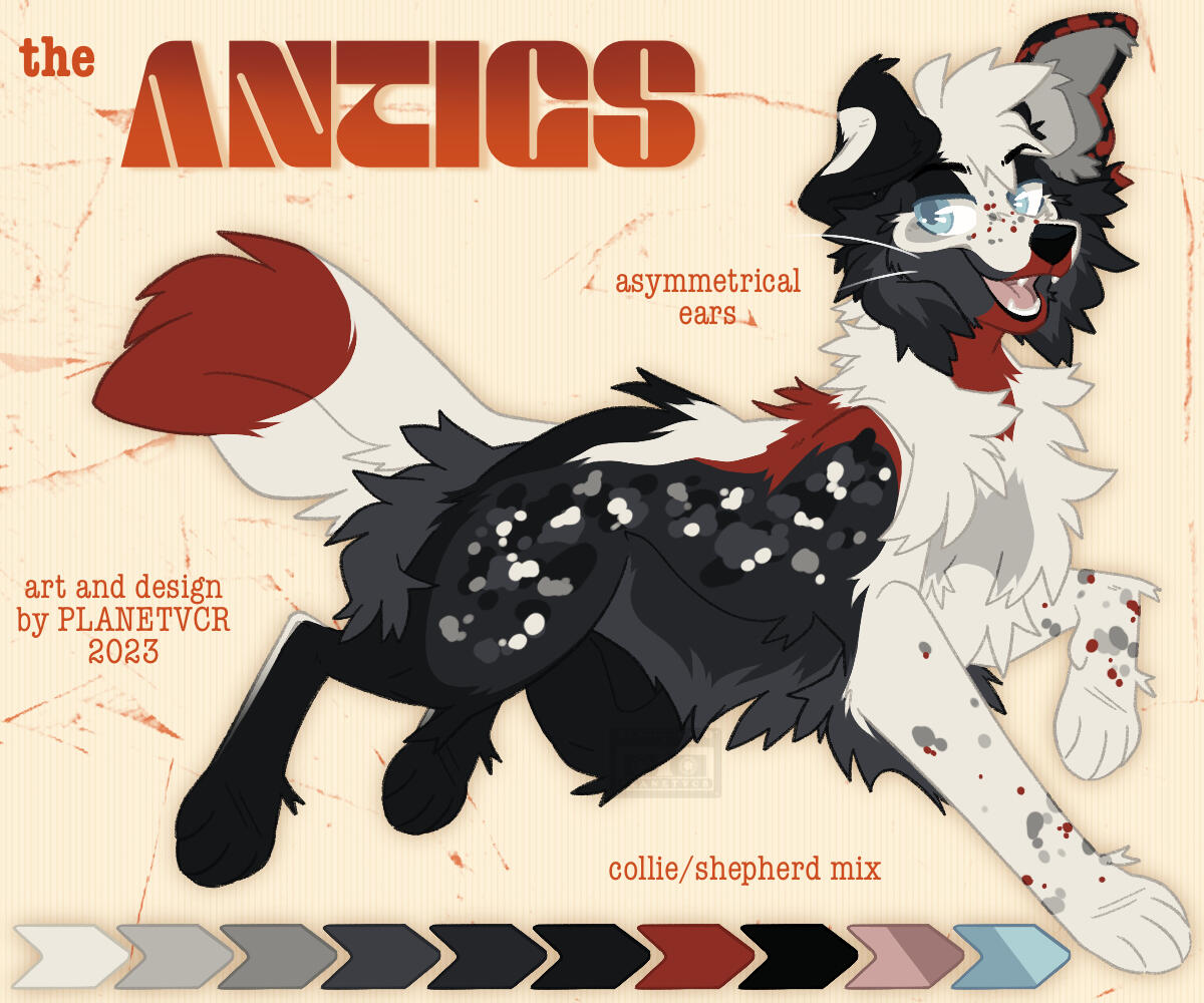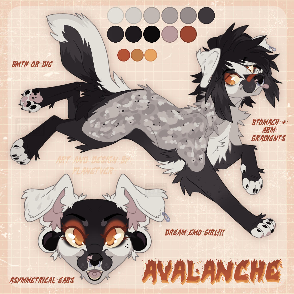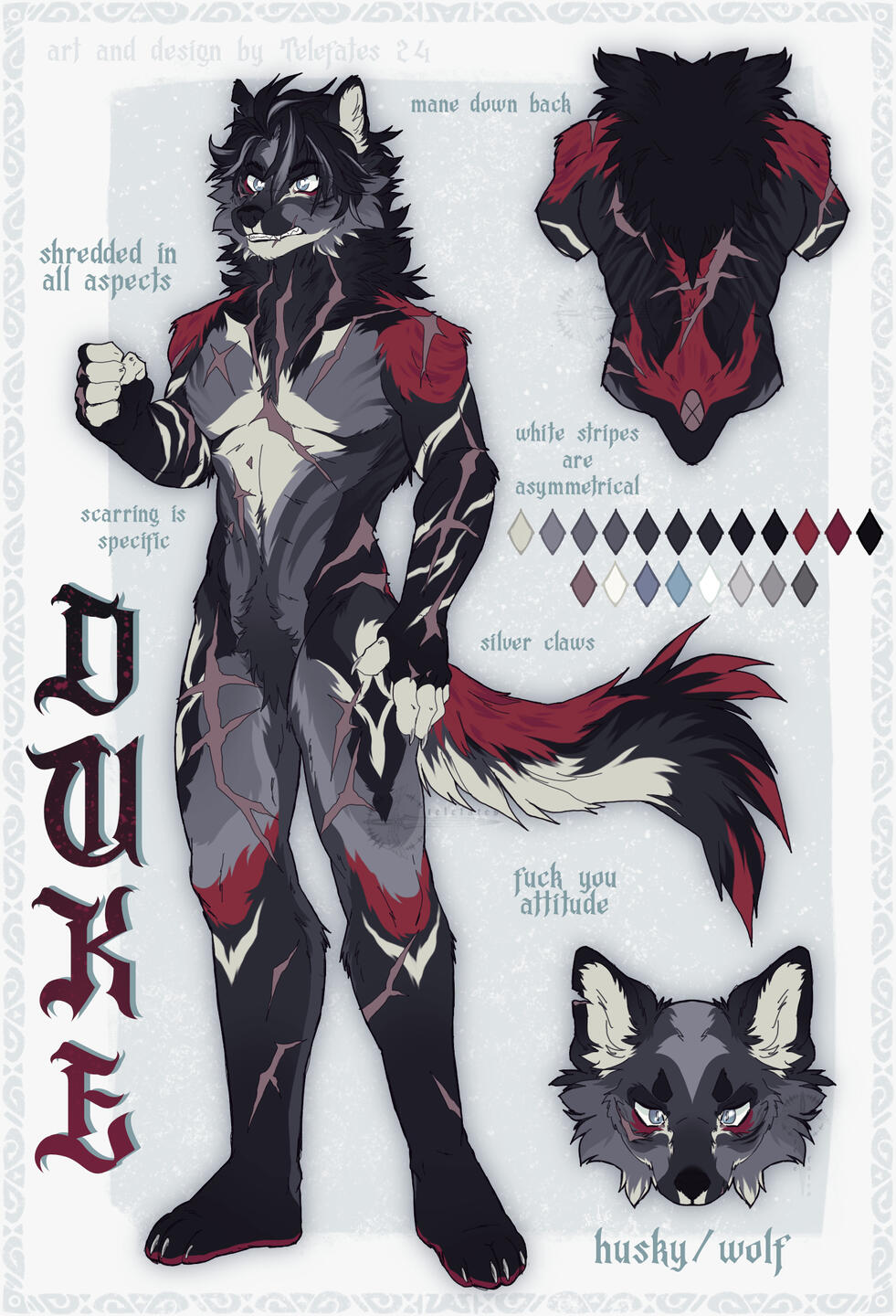 A looser version of a custom design! In my concept work style- anthro or feral, with a symmetrical headshot, back view for anthros, palette, and some written info if requested!